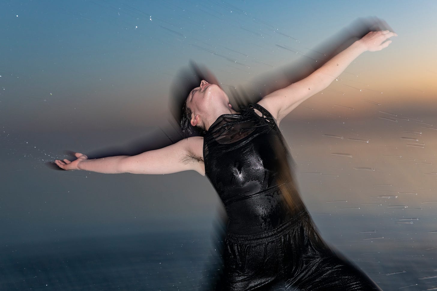 Liquid Love explores chronic illness, hydra-feminism, and bodily resilience through its interrogation of membranes and boundaries, bodies moving like water, and the relational space between performers, audience, and environment. Scenes unfold with careful attention: a lit cigarette marking time, glitter swirling like a private wind, and light and shadow revealing transformation.